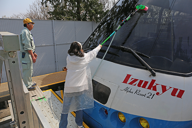 次は「アルファ・リゾート21」の洗車体験。デッキブラシで好きなだけ黙々と洗います。側面は洗車機にかけるようなのですが、正面は今でも手洗いとのこと。”電車の側面を洗浄する「洗車機」に電車にご乗車になったまま「洗車」を体験いただけます。”というイベントもあったようなのですが、その時間は弁当食べてたヨ…。