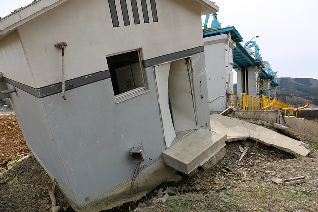 水門自体、津波に呑み込まれていたことが、水門上部の照明の曲がり具合から解ります。