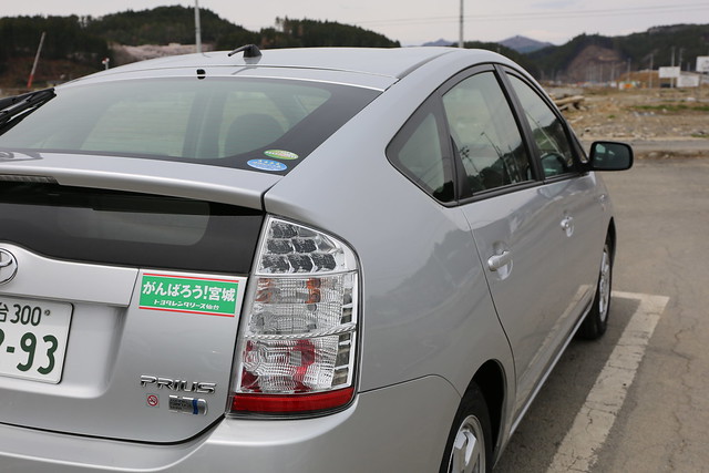 私がレンタカーで借りたプリウスです。「がんばろう」の文字はレンタカーだけではなく町のそこかしこで見ましたが、この凄惨な光景の中で、がんばれがんばれ言われても、私が被災者だったら「何をがんばれというの」という気持ちにもなってしまうような気がします。