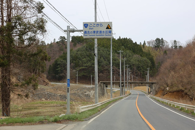 被災地が近づくと、真新しい「過去に津波」の看板が目に入り、初見の私には緊張が走ります。海沿いに走っているとこの看板は至る所で目にします。看板をよく見ると、何か上から貼り付けてあるように見えます。akoustamさんの写真(1番下)によると、どうやらこの看板は元々は「津波浸水<想定>区域」のものだったようです。