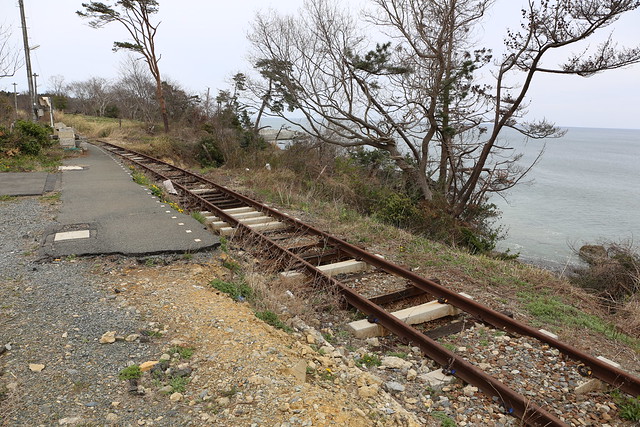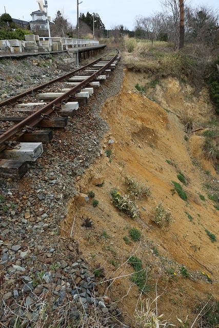 気仙沼中心部に入る道の途中で、「小金沢駅こちら」の看板を見つけました。すぐ海という場所だったので寄ってみると…やはり、駅など跡形もありません。正しくはここの駅舎は流されたと言うより、大きく破壊されたので撤去したようです。