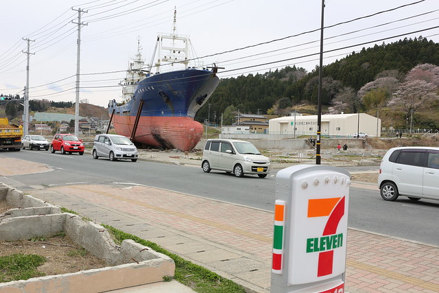 気仙沼市中心部に到着。大きな船がすぐ目に入ります。