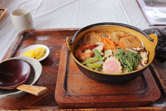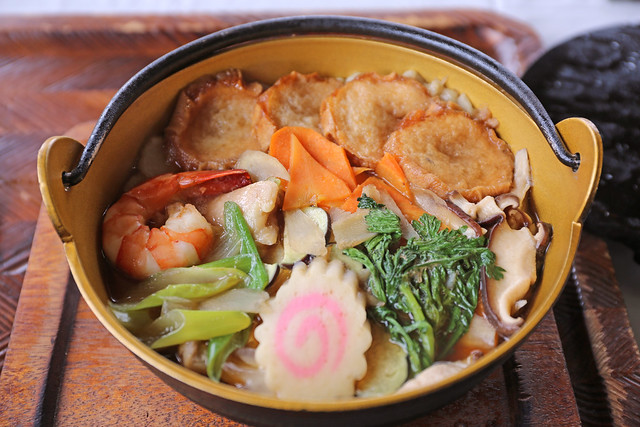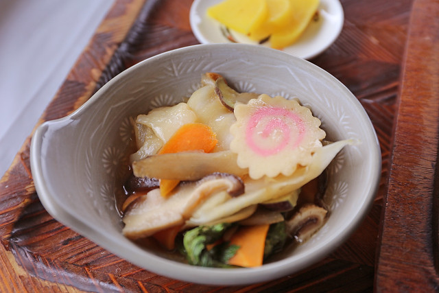 なると、春菊、油麩、エビ、ネギ、ゴボウ、茄子、人参、椎茸、鶏肉、そして底に沈んでるであろうすいとん。