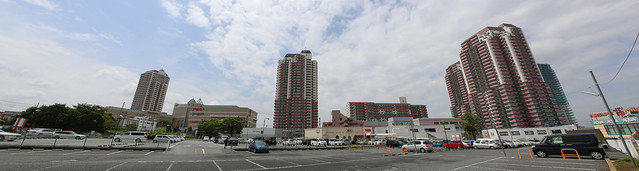 広大な駐車場からの眺め。無料ではありませんが、ユーカリプラザでいくらでも買い物すれば、5時間無料です。EOS 5D3で手持ちパノラマ撮影しました。(Photoshopで3枚を自動合成)