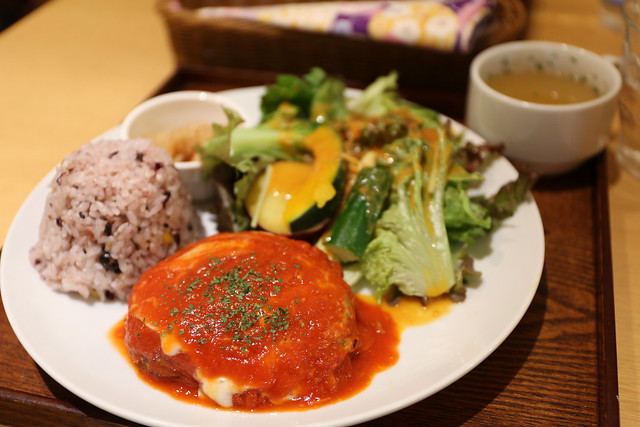 正午からの放送でお昼に何も食べていなかったため、周囲を散策してもこどグルっぽい店がなかったことから、結局、ユーカリプラザ3Fの「茶和屋」(さわや)でヘルシーなランチを頂きました。ひじきハンバーグです。どうみても女性向きの店なので物足りないかと思ったのですが、結構満足できました。