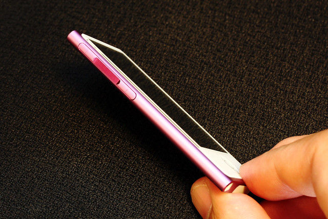左側面の物理ボタンは一体型ながら上下を押せば音量調整、中央を1回押せば再生/停止、ダブルクリックで次の曲のジャンプ、トリプルクリックで曲の先頭(or 前の曲)にジャンプなど、見ないで操作するボタンとしては優れており、私が愛用しているウオークマンA860シリーズと比較して羨ましい部分。A860はちょっと指でボタン形状を探らないとボタンの機能が把握しにくい上に、再生停止しようとしてスキップしちゃったりとか誤操作もあるので、nanoのボタンは羨ましいところです。