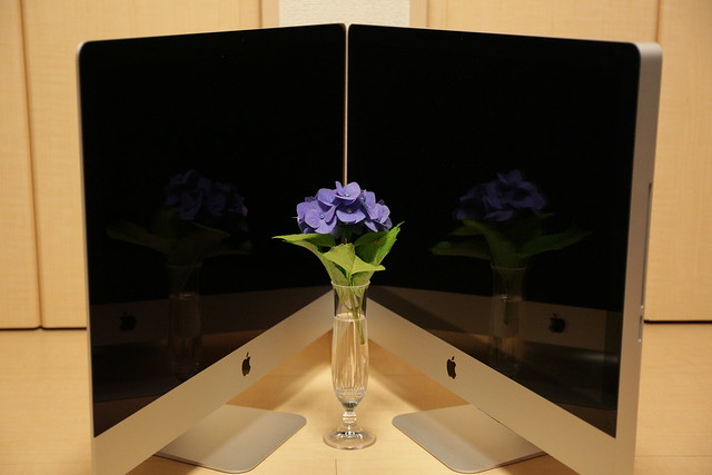 液晶ディスプレイのドット抜けはなし、映り込みは確かに大幅軽減されている。映り込みの様子をLate 2009と比較したのが上の写真だ。Late 2012側の映り込みの少なさがよく解るが、肉眼で見ると映り込みはゼロではない。半分以下になったという印象だ。反射像も2重ではなくなった。