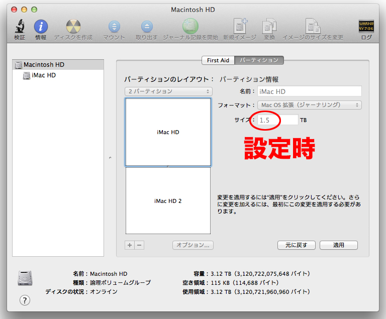 たとえばスライダを移動して 3TB を 1.5TB + 1.5TB に分けたとしても、できあがったパーティション1.37TB + 1.62TB になってしまう。