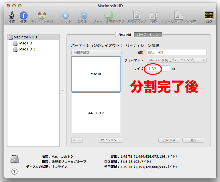 iPhotoライブラリを同一Mac上のツマのアカウントと共用する関係上、内蔵HDDのパーティション分けを行い、そこにiPhoto Libraryを置く必要がある。(もしくは、ディスクイメージを作成して共有フォルダに置く方法や、外付けHDDを用いる方法があるが、ここでは割愛。)
