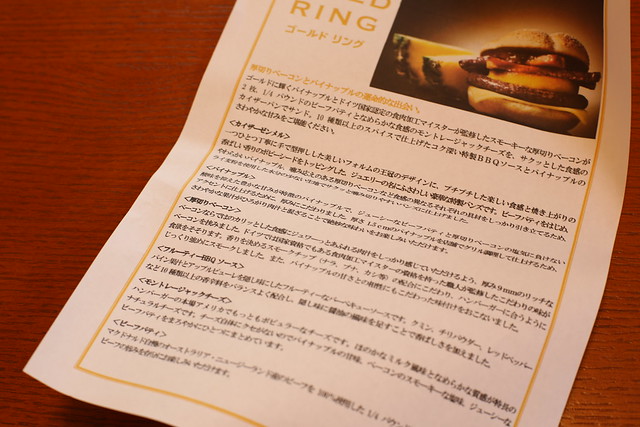 蓋を開けてみれば、私が購入した自宅最寄りの大型店舗では昼過ぎに、二番目に家から近い大型店舗でも15時過ぎにに売り切れになったというマクドナルドの1,000円バーガー「クオーターパウンダー・ジュエリー」シリーズ第一弾「ゴールド・リング」。