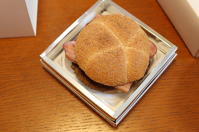 かなり堂々とした佇まいですが、もう少し厚みがあるものを想像していました。あとで気づいたのですが、オフィシャル写真によると2枚の厚切りベーコンはクロスさせるのが正しいサンドの仕方ではないでしょうか。このように2枚並列にすると厚みが出ません。この方が食べやすいのは確かですが…。