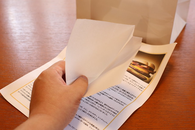 おそらく食べるときにここにバーガーを入れると食べやすいであろう袋が付属しますが、特に説明はありません。ウッカリするとナプキンと間違われると思います。