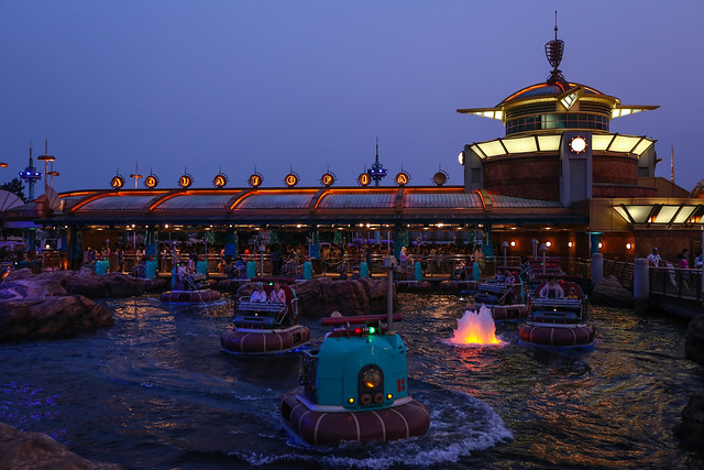 なんか園内に同じお揃いの現在販売中のディズニーTシャツを着たお客さんが多いな~と感じていたのですが、これで理由がわかりました。ずぶ濡れになるので、売店でTシャツを買って着替えざるを得ないのです。ただ、Tシャツは1着2,000円するので、家族4人で着替えると8,000円になります。そんなに高く付くアトラクションというのも面白くないので、着替えませんでしたが…。