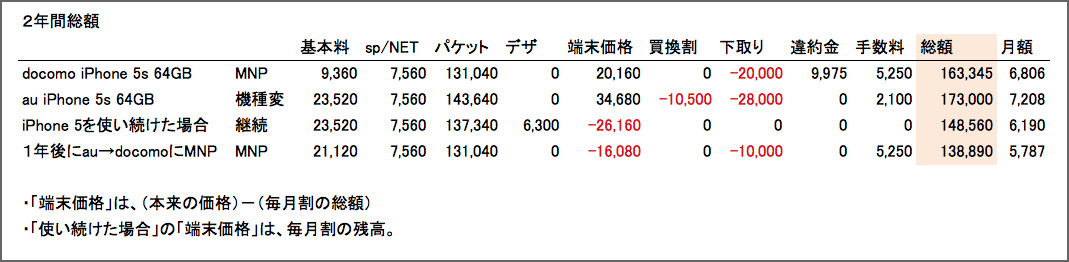 しかしdocomoの方が途中解約時は不利かと思っていましたが、計算してみるとau内で5sに機種変しても大差ないんですね。これはauがキャリア内機種変ユーザーに冷遇しすぎでしょう。少なくともパケット定額は5,985円に戻るのではなく5,480円のままにして欲しく、またデザリングの無料期間も開始時期をリセットするなどの施策が欲しいところです。