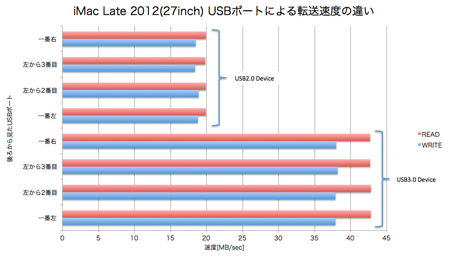 iMac Late 2009にはUSBポートによる速度差があったのだが、Late 2012のUSBポートはどうだろうか。テストしてみる。ただ、手元にUSB3.0の速度を生かせるデバイスがあまりなく、Sandiskの45MB/secのCFカードをUSB3.0のカードリーダーとUSB2.0のカードリーダーに挿して速度比較してみた。