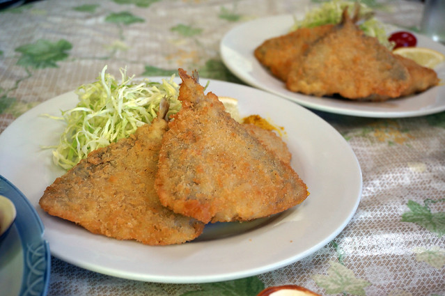 続いて他にメインがあろうがなかろうがこれは外せない、アジフライ。庶民料理ですが、これもけっこう奥が深い。私は割と外でアジフライを注文する派なんですが、ここのアジフライはやや小ぶりながら身が厚くて、意外に食べ応えがありました。もちろんこれも新鮮さが解る美味しさ。1人前3枚を2皿オーダーして、3人で2切れずつ頂きました。