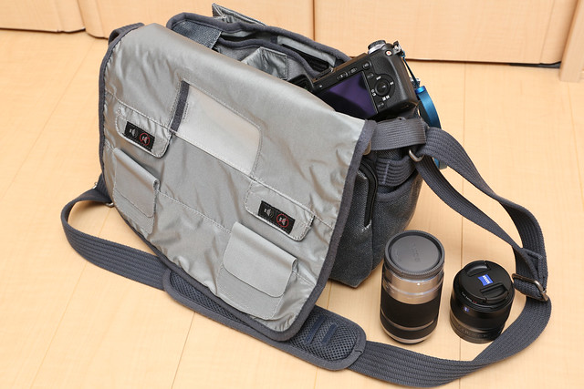 NEX-6には過剰とも言えるサイズ。本体プラス、レンズ2本は余裕です。5D Mark III + 24-105mm F4クラスもも縦位置グリップを付けなければOKです。ポケットがとにかく無数にあり、入るだけ入れると厚みが1.5倍くらいになります。散歩の途中で荷物が増えてもOK。