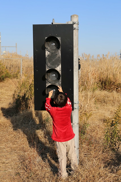 草っ原の真ん中に突如信号機。たまらずなで回す息子。