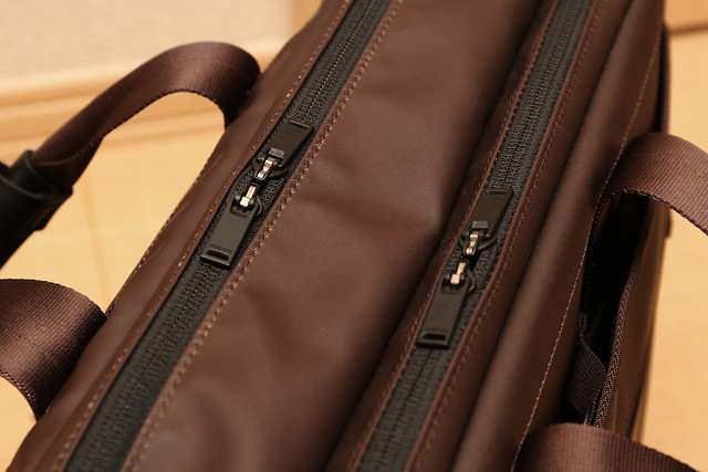 一方で使った上で困っていることが2点ほどありまして、まず1つ目は、メインのコンパートメントが2つあるので(片方はPC用ということらしい)、上から見た状態では目的の荷物がどちらに入っているかが非常に分かりにくいこと。よく見れば微妙にシンメトリカルではないので区別は付くんですが、深夜帰宅時に薄暗い玄関で家のカギを出す場合など、一発で「あたり」を引くのは困難です。