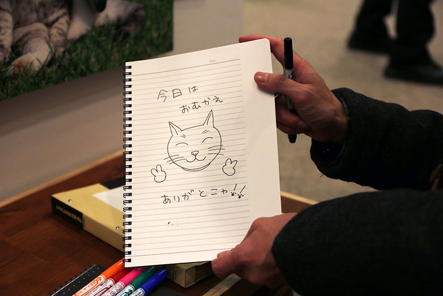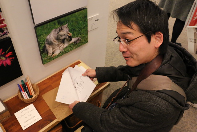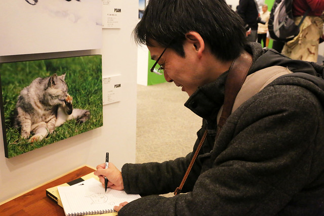 そしてこちらは街猫フォトグラファー四本木氏の展示と、氏が所属する写真サークルPSAMの展示。昨年はPSAMとしてだけの展示でしたが、今年は四本木さん個人でのブースも持ったという気合いの入れよう。昨年のPSAMの芳名ノートはむっちーさんのイラストの餌食(ぉ になっていましたが…