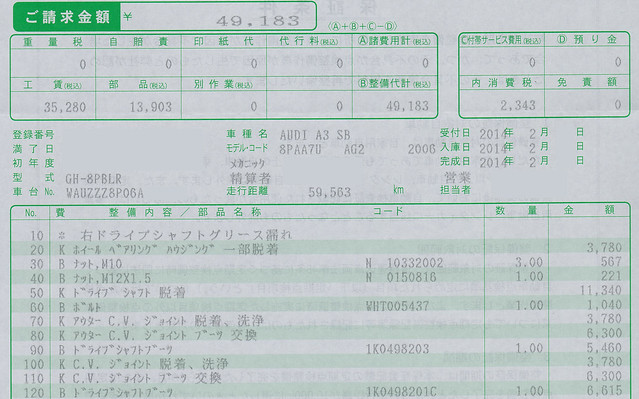 Audiは点検は原則一年に一回なので、点検直後に破けると最悪一年間は破けたのに気がつかずに走ってしまう可能性が考えられますが、ディーラー曰く、次回の点検までに破けてしまいそうなブーツは何となく分かるので、その際に交換を勧めるためほぼ問題がないとのこと。私のケースは点検直前に破けたようなので、一年前の1月の点検では予見が難しかったのでしょう。10月から通勤で毎日乗るようになって負荷が増えたというのもあるでしょうし。