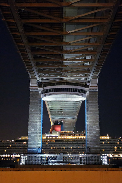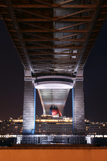 ベイブリッジの高さは第二世代のクイーン・エリザベス号を参考にしたと言われていますが、さらに大型化した第三世代は海面からの高さが56.6mあるそうで、55mのベイブリッジの下をくぐるために、干潮時刻を待つという異例の措置で入港が実現しました。