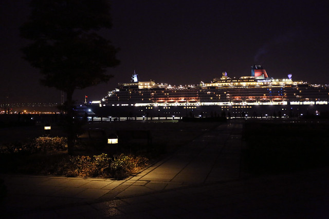 さて、接岸予定時刻の23:00少し前に、漆黒の海にクイーンエリザベス号が現れました。特に道路を封鎖していないベイブリッジへの接触を警戒して慎重に慎重に入港するのかと思いきや、意外とスーッと通り抜けました。