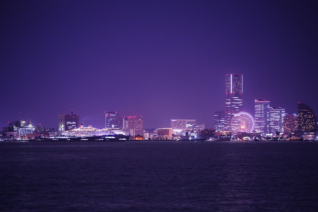 上に掲載したベイブリッジ通過時のカットは、とにかく初めてのことなのでどう撮っていいか方針が立たず、船がある程度の速度で移動することを考えればあまり遅いシャッター速度にはできないだろう(船が流れてしまうだろう)ということで、EOD 5D Mark III + EF 24-70mm F4L IS USMにて、ISO10000にて撮影しました。