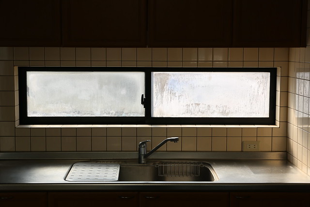 撤去予定の2Fキッチン。窓の汚れは合わせガラスの内層なので落とせません。どうしよう。