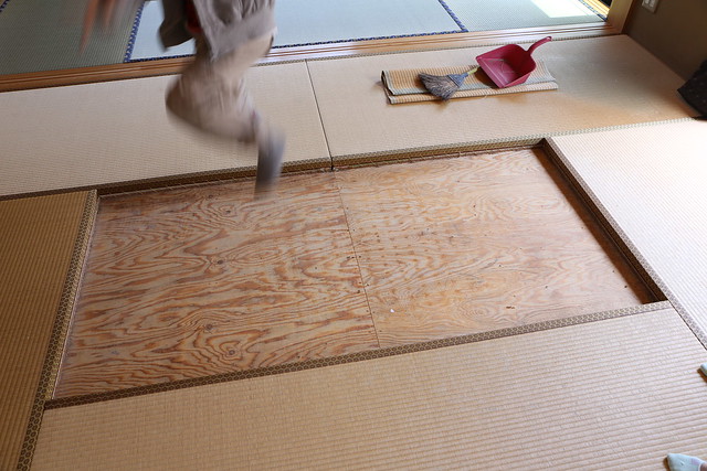 建築以来交換されることがなかった(たぶん)畳が1枚1枚上げられ、床板があらわになります。