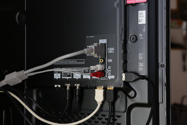 接続端子は左側(背面から見ると右側)に集中。B-CASカードは従来通り大型タイプです。HDMIは3系統。すでに「DIGA」「Apple TV」「PS4」で埋まってしまいました。ここはできれば4系統欲しかったところです。でもD端子が1系統でも残っていてWiiを繋ぐのに助かりました。