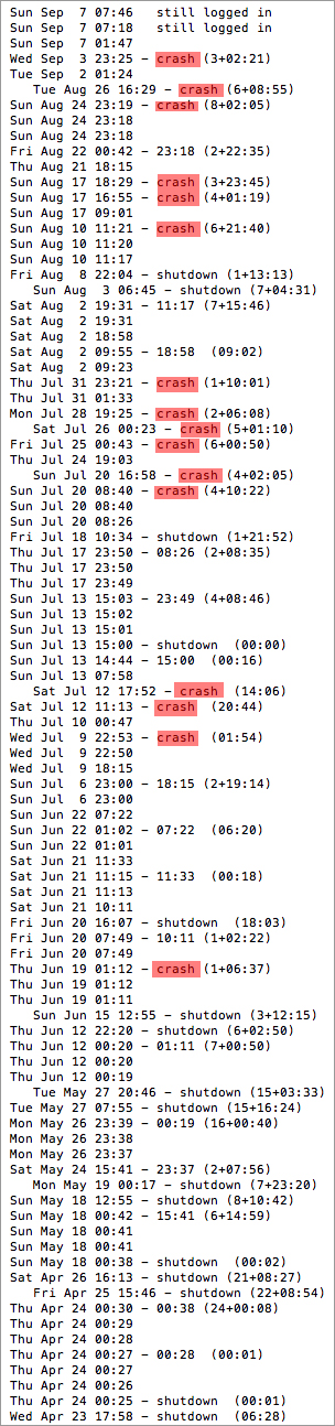 さらに、ターミナルからlastを叩いて長期的なクラッシュ履歴を調べてみると、