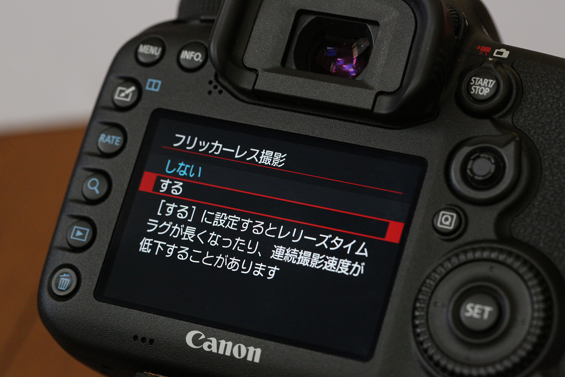 フリッカーレス撮影機能はメニューからON/OFFします。デフォルトはOFFです。ONにすると原理上、シャッタータイムラグが大きくなったり、連写速度が低下したりするバーターがありますが、そこを機械に任せるのがこの機能の趣旨なので、こればかりは仕方ありません。
