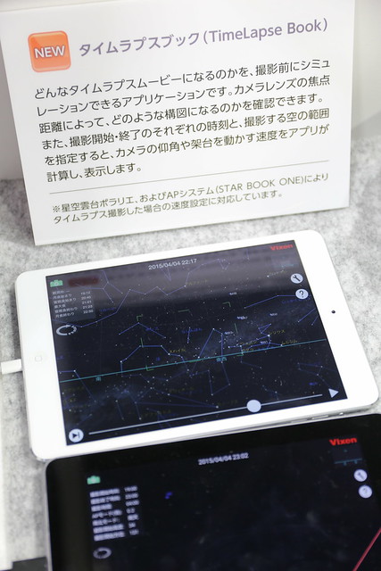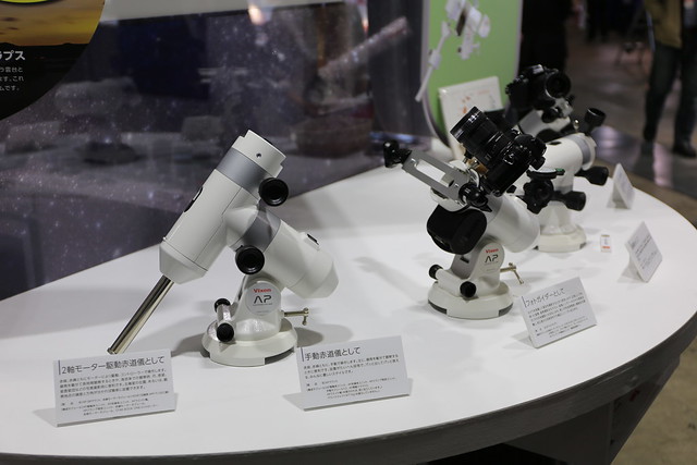 ブースにいた岩手県の天文台の方と少しお話しできたんですが、最近のデジカメはISO感度が高くできるので冒頭のような写真は仮にポラリエがなくてもそこそこ撮影可能なんだとか。S/Nを稼ぎたいなら「比較明合成」とか使えば良いらしい。