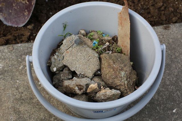 ウッドデッキ前の産廃っぽい瓦礫が混じっている土の部分を掃除。