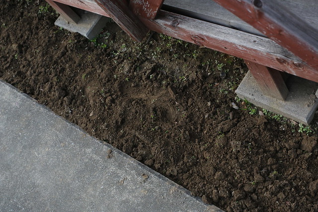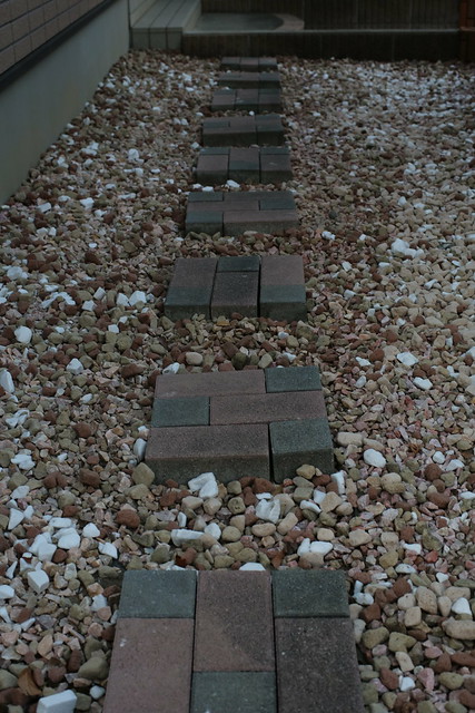 そしてなぜか前のオーナーさんの頃から不等間隔になっていた踏み石を等間隔(ただし目測)で整列。砂利が敷いてあるので砂利をよけて作業が必要。結構めんどい。