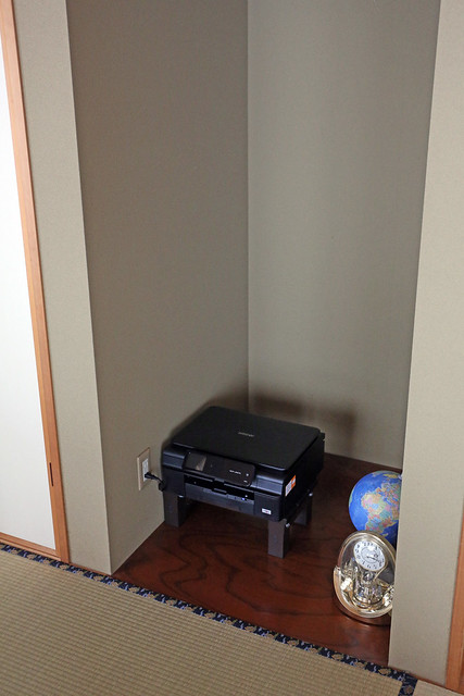 本来の設置したい場所である1F和室に持って行ってみました。床置きだと使いにくいので、適当な手持ちの台に乗せてみました(元々盆栽台として売られていた台のようです)。うーん、ちょっと無骨ですね。あまり深く気にしたことはなかったですが、こうやって見るとCanon PIXUSなどは相当リビングでの見栄えに気を遣ってるんだなぁ、ということがよく分かります。