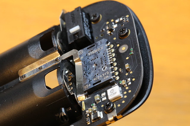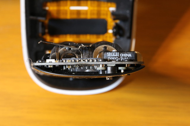 それではセンサー位置の調整はできないものかと、バラしてみました。写真中央の大きめのICのようなものが、レーザーセンサー込みのSOCのようです。
