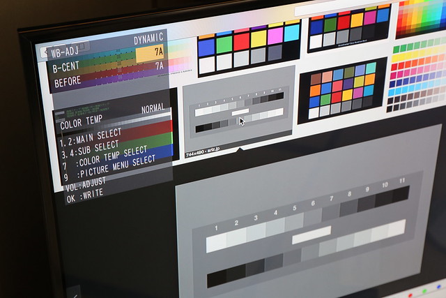 仕方がないので自分でサービスモードに入って、R/G/BのGAINとCENTを弄るんですが、基準信号の発生器は持っていないので、MacBook ProをHDMIで繋いでカラーチャートやグレーチャートを表示させて調整しました。GAINは肌色を基準にし、CENTはグレースケールを基準に合わせれば良いと思います。たぶん。