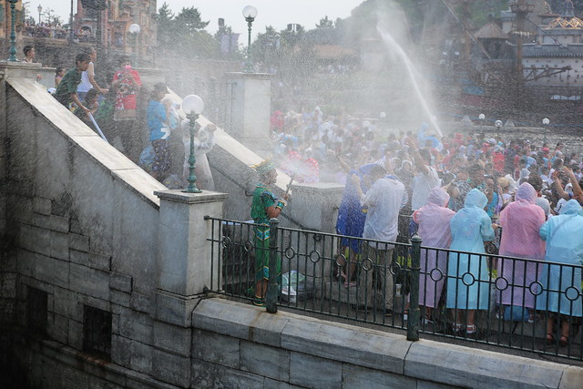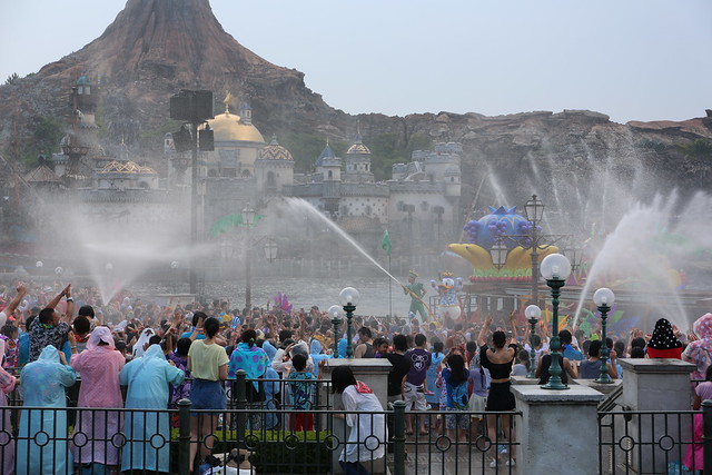 「ミニーのトロピカルスプラッシュ」というフェスティバル。平たく言えば昼のショーです。これで濡れるのは2年前に経験して分かっていたので、遠巻きに眺めていたのですが、俯瞰しているとやたらと訓練された人たちに集中的に放水されているエリアがあることが分かりました。