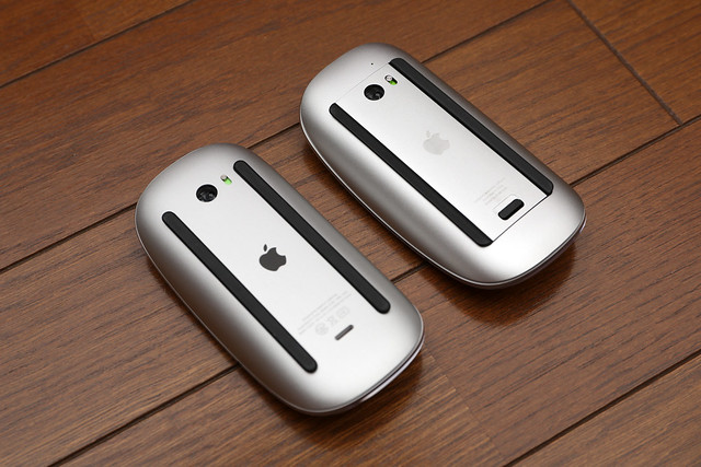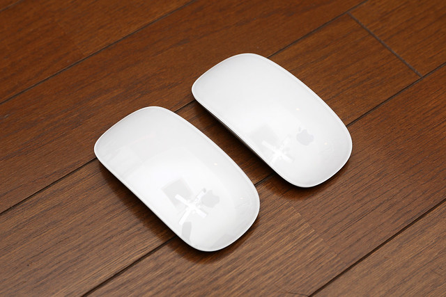 従来のMagic Mouse(写真奥)と。この角度からでは差が解りません。特に薄くなったとかそういうことも感じられません。