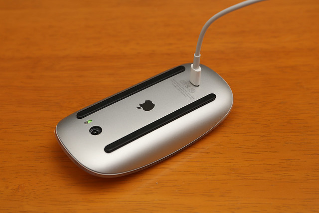 ケーブルを接続すると自動的にMacへのペアリングと、充電が行われます。ご覧の通り充電中は使えません。この間抜けな姿は、大喜利のネタになりそうです。
