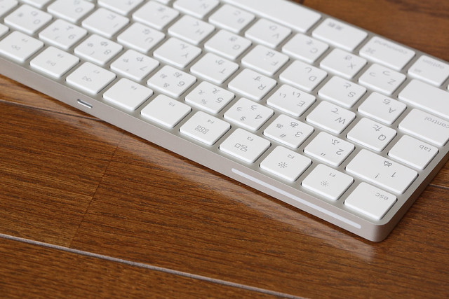 キートップの文字が新型では薄くなっているのは写真のせいではなく、本当に薄くなっています。OS Xの文字が小さくなってきている点といい、最近のアップルは視認性を差し置くことが多くなったなぁ…。