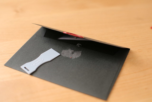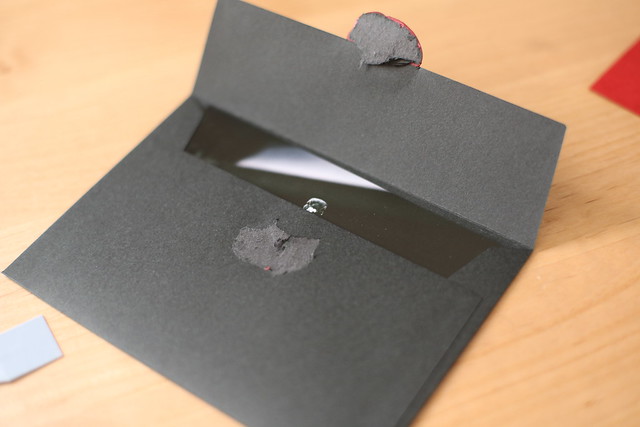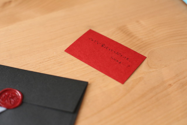 開きました。開きましたけど…ほら、中の黒い招待状にも白いのり状の物が付いちゃってるじゃないですか。だから蝋なんて凝ったことすると…