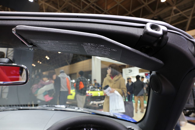 モーターショー同様、結構いろんな車に座れます。無謀にもコペンに座ってみました。意外と乗れました。これは私の目の高さの眺めです。これではルーフが閉まらないように感じたのですが、係の方に閉めてもらったらちゃんと閉まりました。屋根も緩やかな凸状なので頭がぶつからないんですね。信号の見落としだけが心配ですが…。