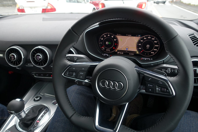 宇宙から降ってくる謎のCMでお馴染みのTT。実車を見るのも乗るのも初めて。他のAudi車より無機質さが際立っていて、なるほど宇宙から降ってくるイメージというのも頷けます。メッキ加飾がミニマムということもあり、ボディが白色だとあの世界的に有名な某特撮宇宙映画に出てきそうなデザインテイストです。
