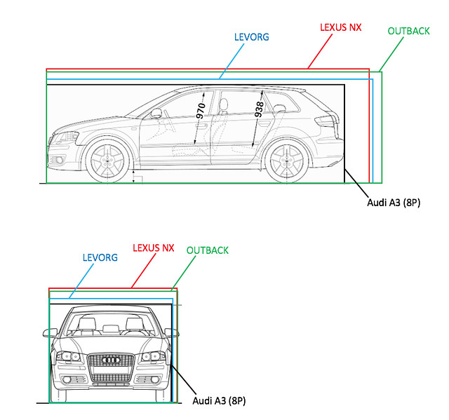 しかしセールス氏に話を聞くと、旦那様が気に入っても奥様が大きすぎると難色を示すケースが多いとのこと。そうは言ってもねぇ、A3より少し大きいクラスを探すとなると、OUTBACKだろうがLEVORGだろうがNXだろうが、図面の上では誤差レベルに見えるんですが、どうでしょうか?