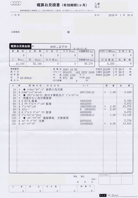 Audi A3 Sportback (8P-BLR)2006年型の10年目の法定点検費用を公開。