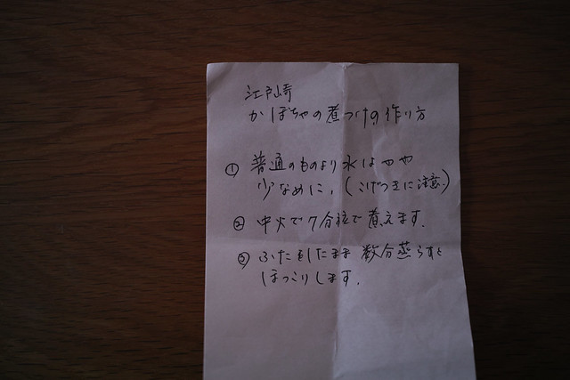 同梱されていた煮付けの作り方メモ。作り方と言っておきながら醤油と砂糖は言わなくても分かるでしょう的な感じがとても良いです(笑。