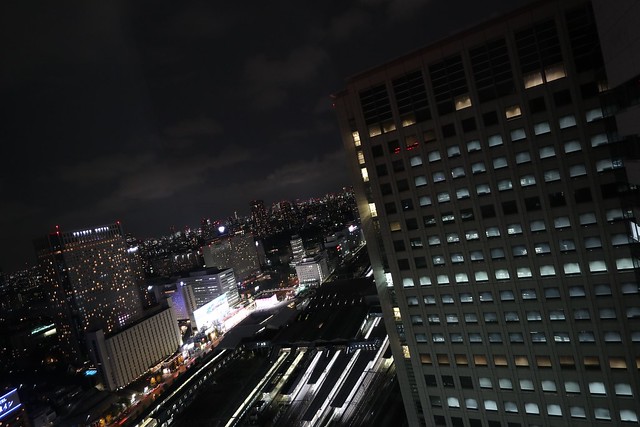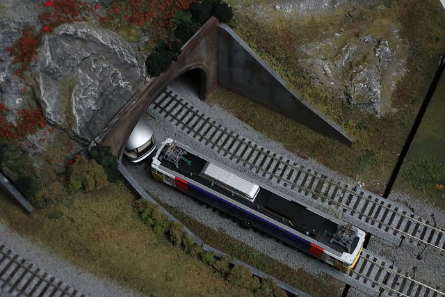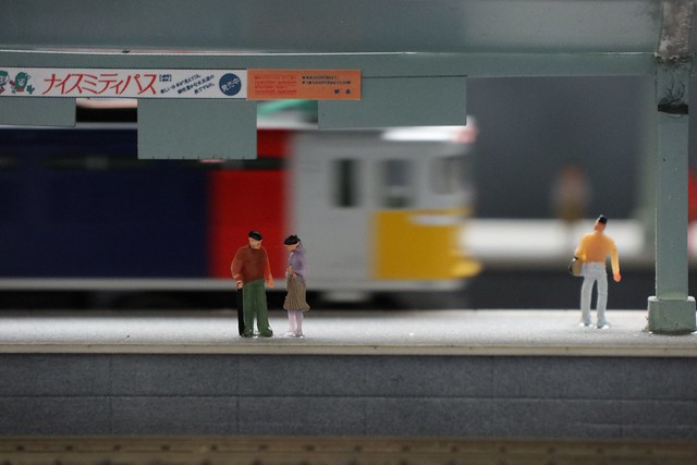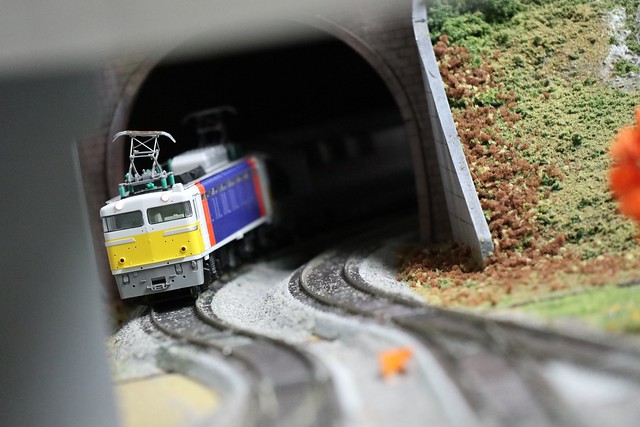 一眼レフEOSから移植された動体予測AFのデモのために用意された鉄道模型ですが、ちょっと夜のイベント×レンズのテレ端f/6.3という条件ではAFの食いつきは芳しくありませんでした。特にこのカットの条件のようにトンネルから出た瞬間を押さえようとする場合など、苦手なシーンはあります。なお、このカットは置きピンで撮影したもの。